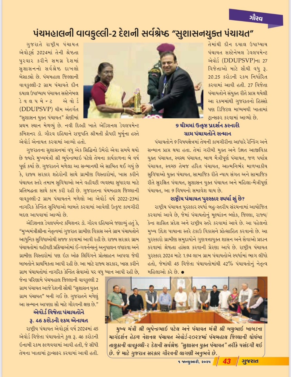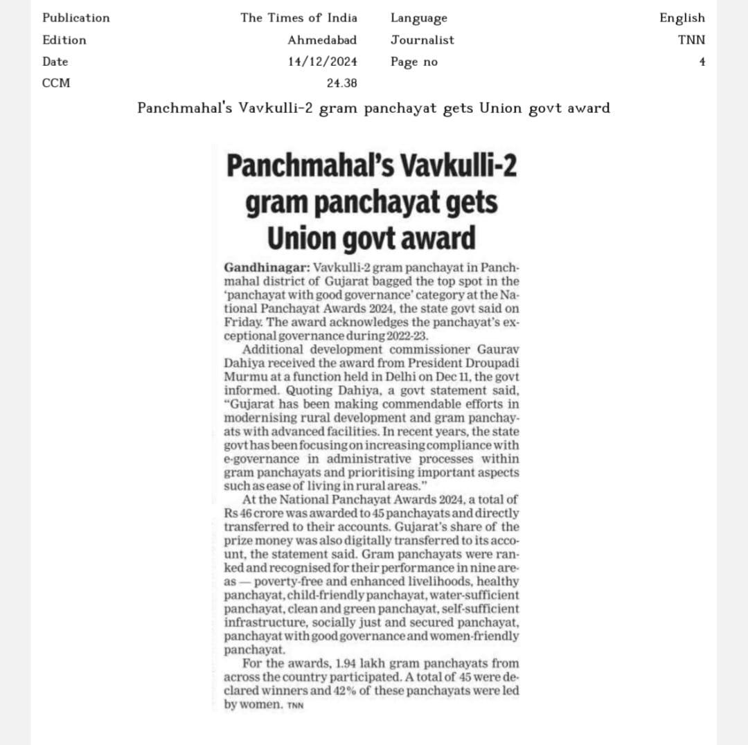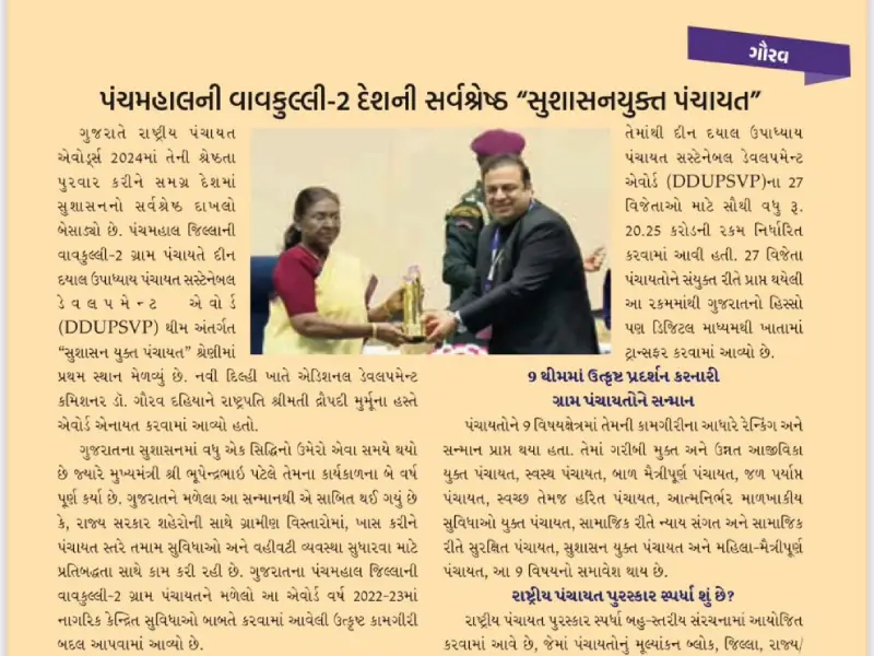 Panchmahal's vavkuli-2 gram panchyat gets Union govt Award